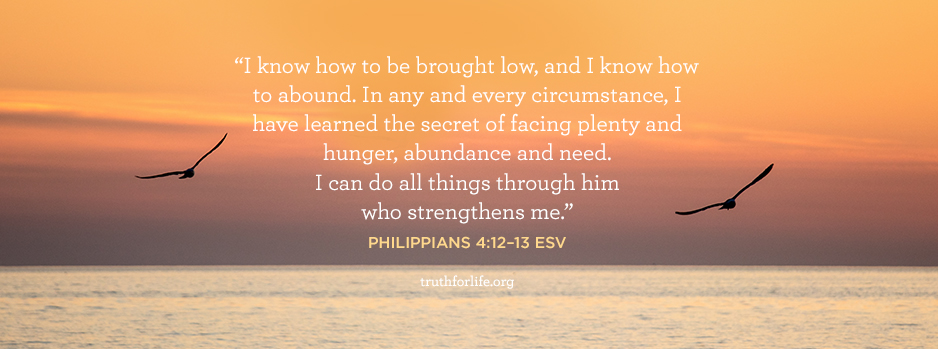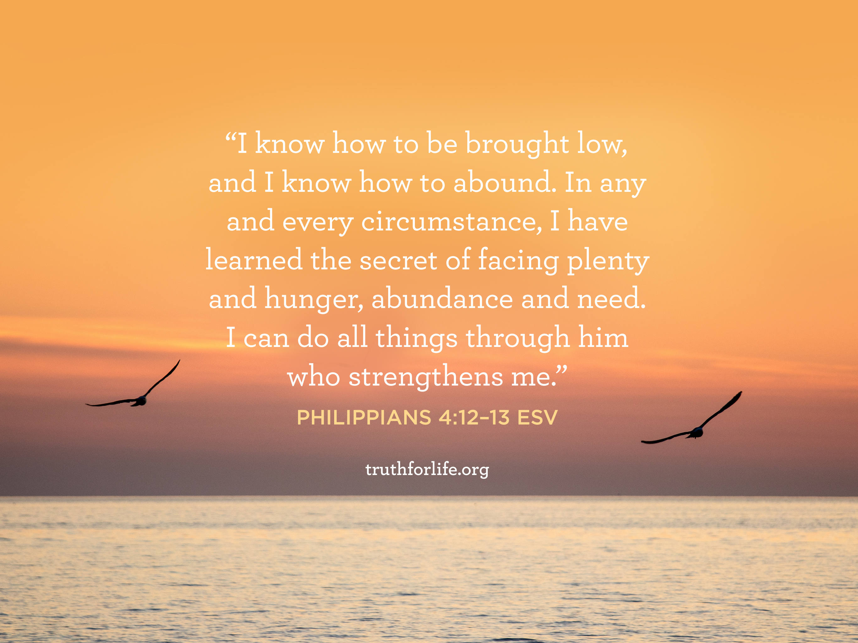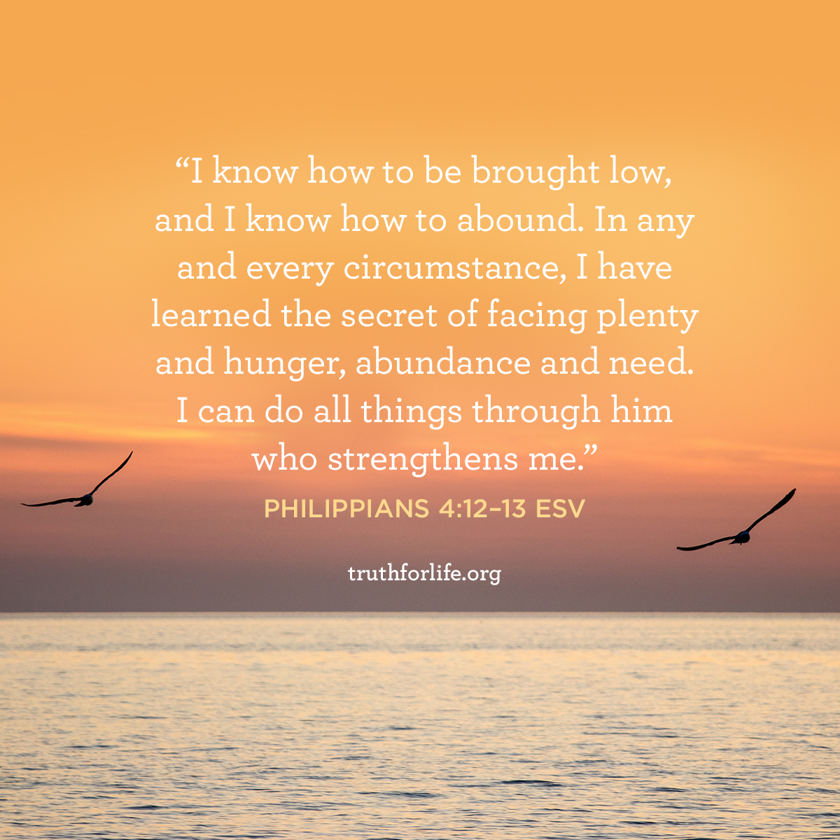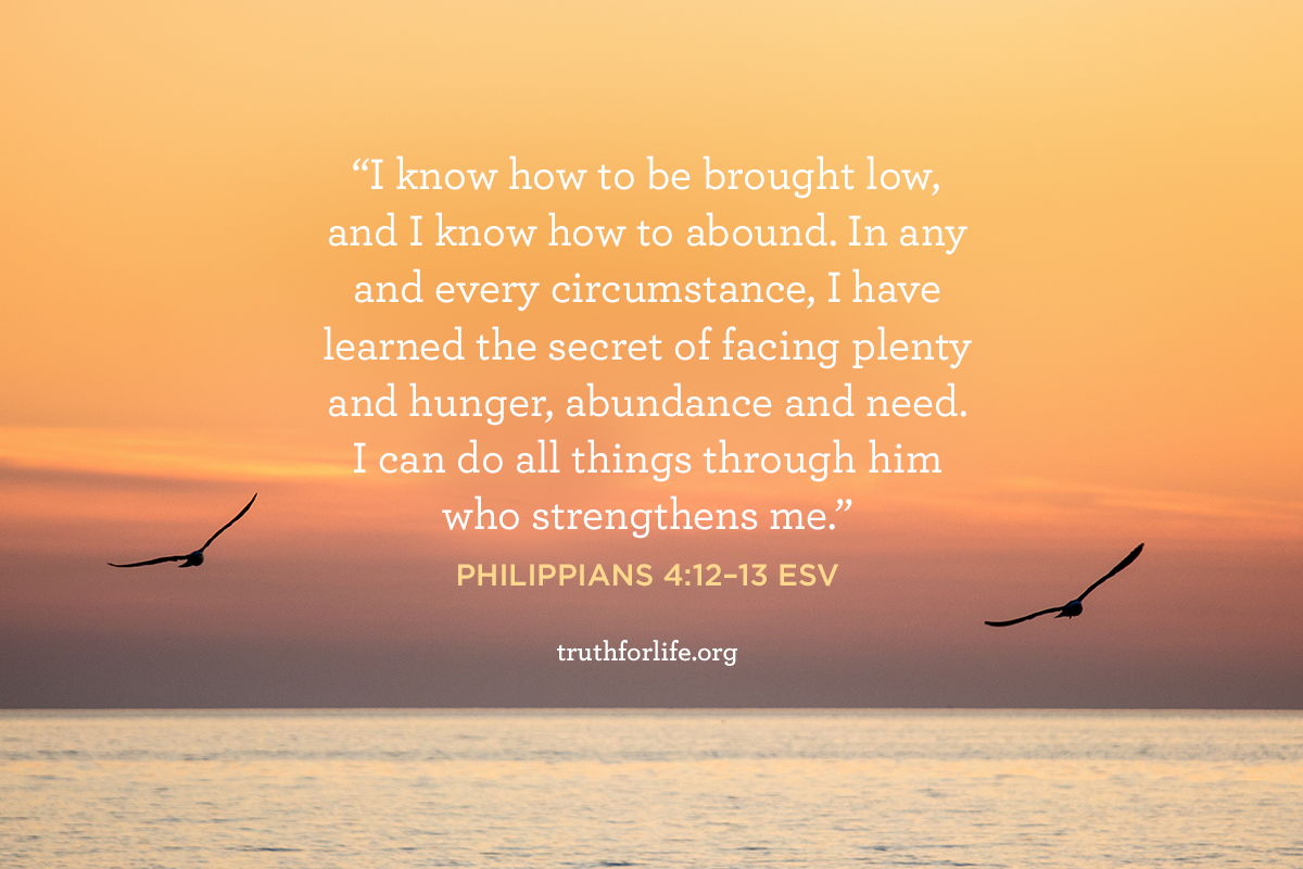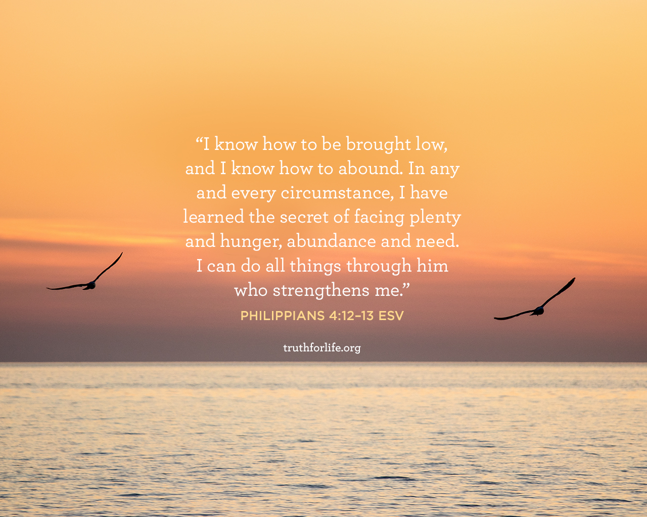 "I know how to be brought low, and I know how to abound. In any and every circumstance, I have learned the secret of facing plenty and hunger, abundance and need. I can do all things through him who strengthens me."