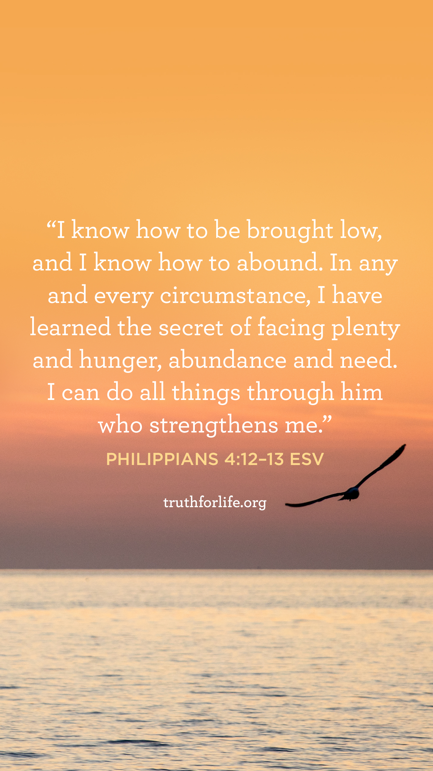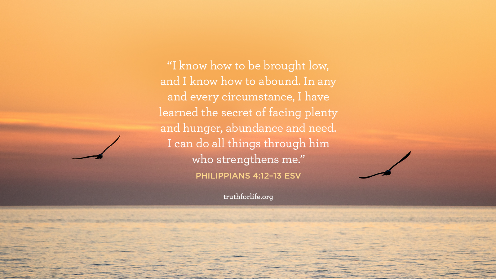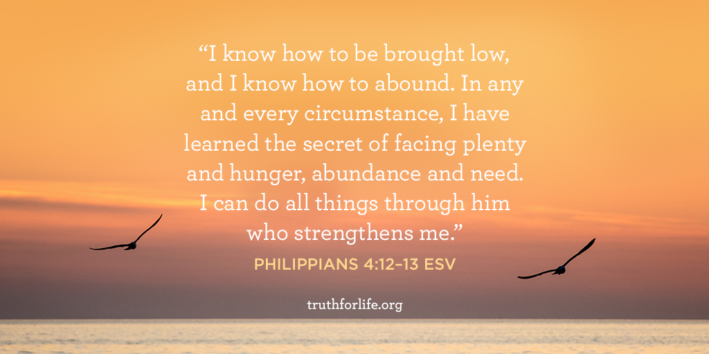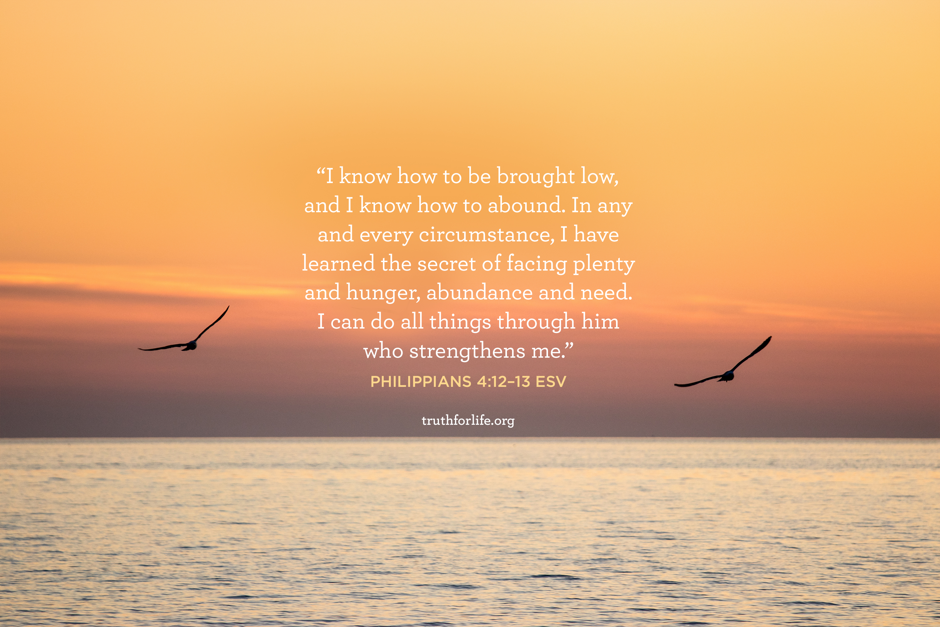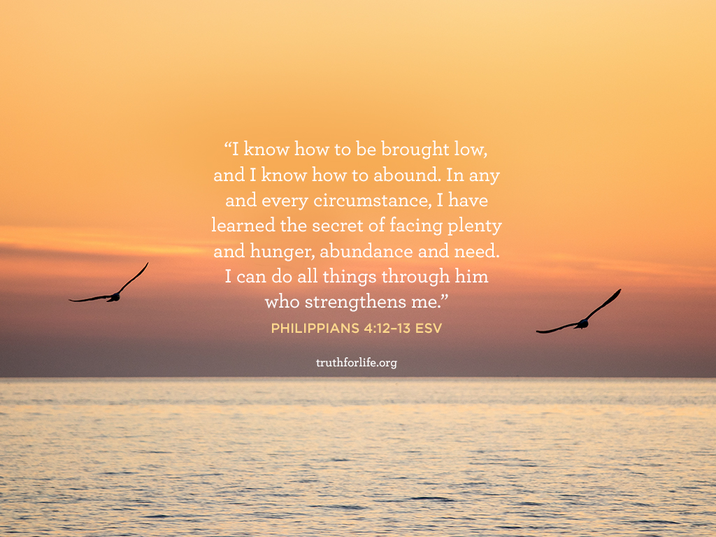 "I know how to be brought low, and I know how to abound. In any and every circumstance, I have learned the secret of facing plenty and hunger, abundance and need. I can do all things through him who strengthens me."