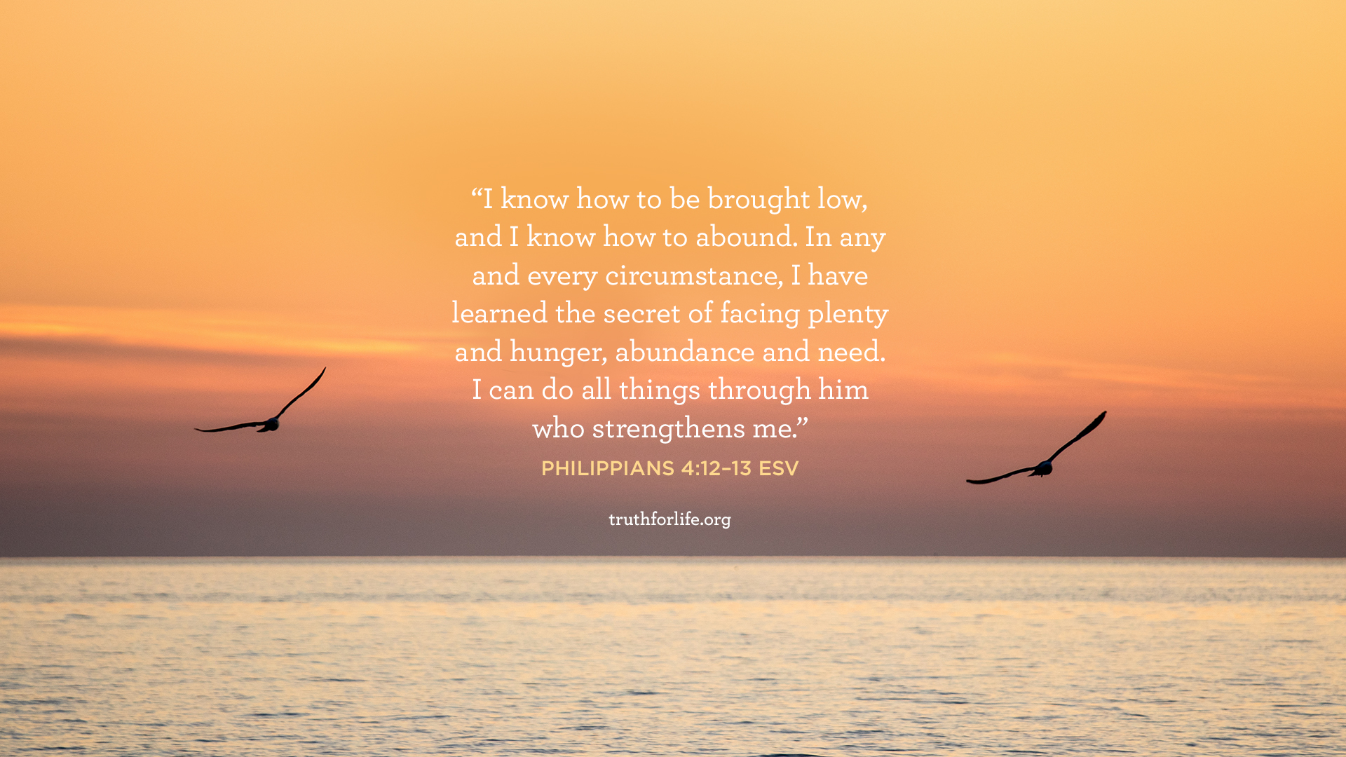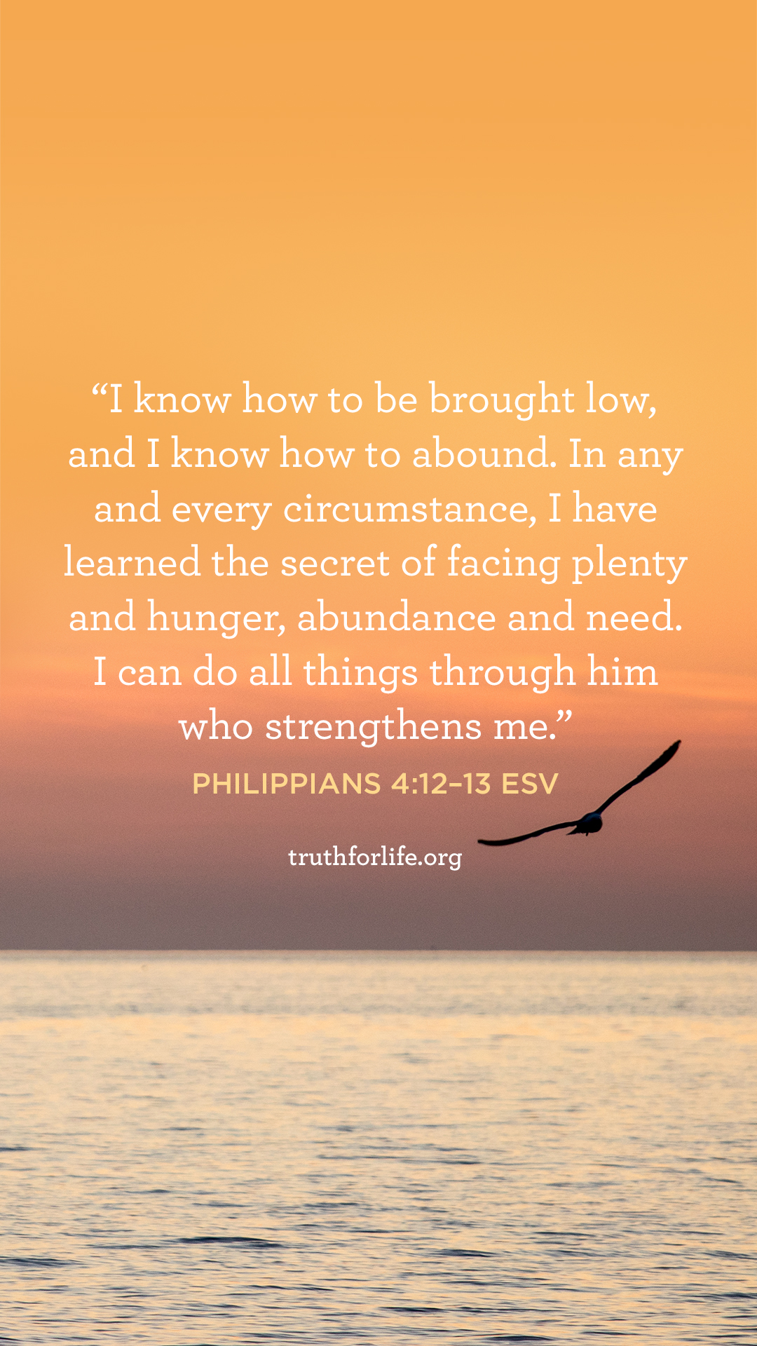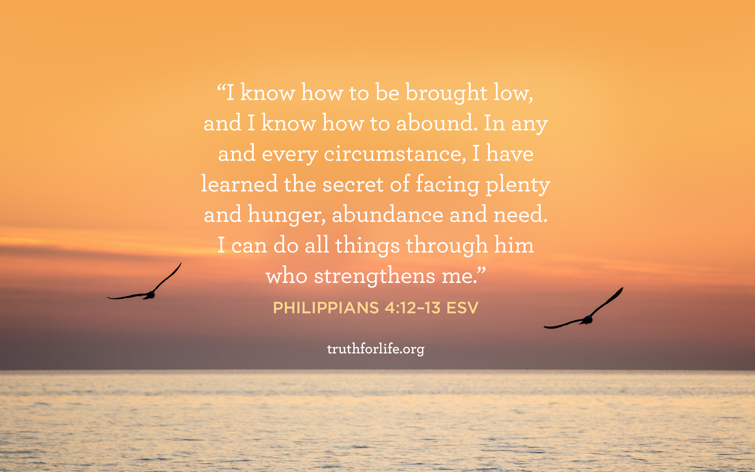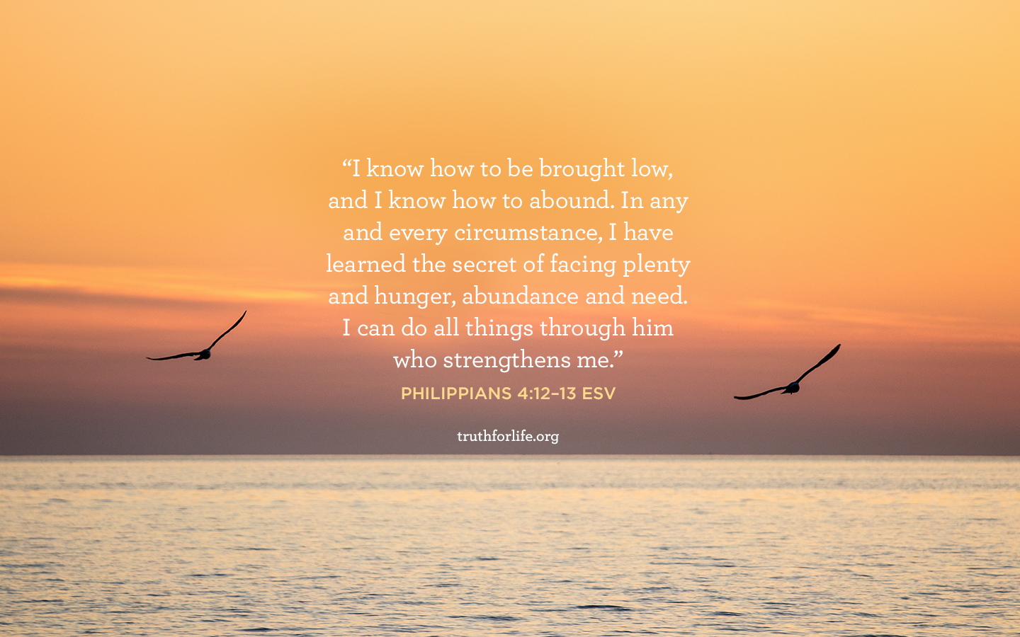 "I know how to be brought low, and I know how to abound. In any and every circumstance, I have learned the secret of facing plenty and hunger, abundance and need. I can do all things through him who strengthens me."