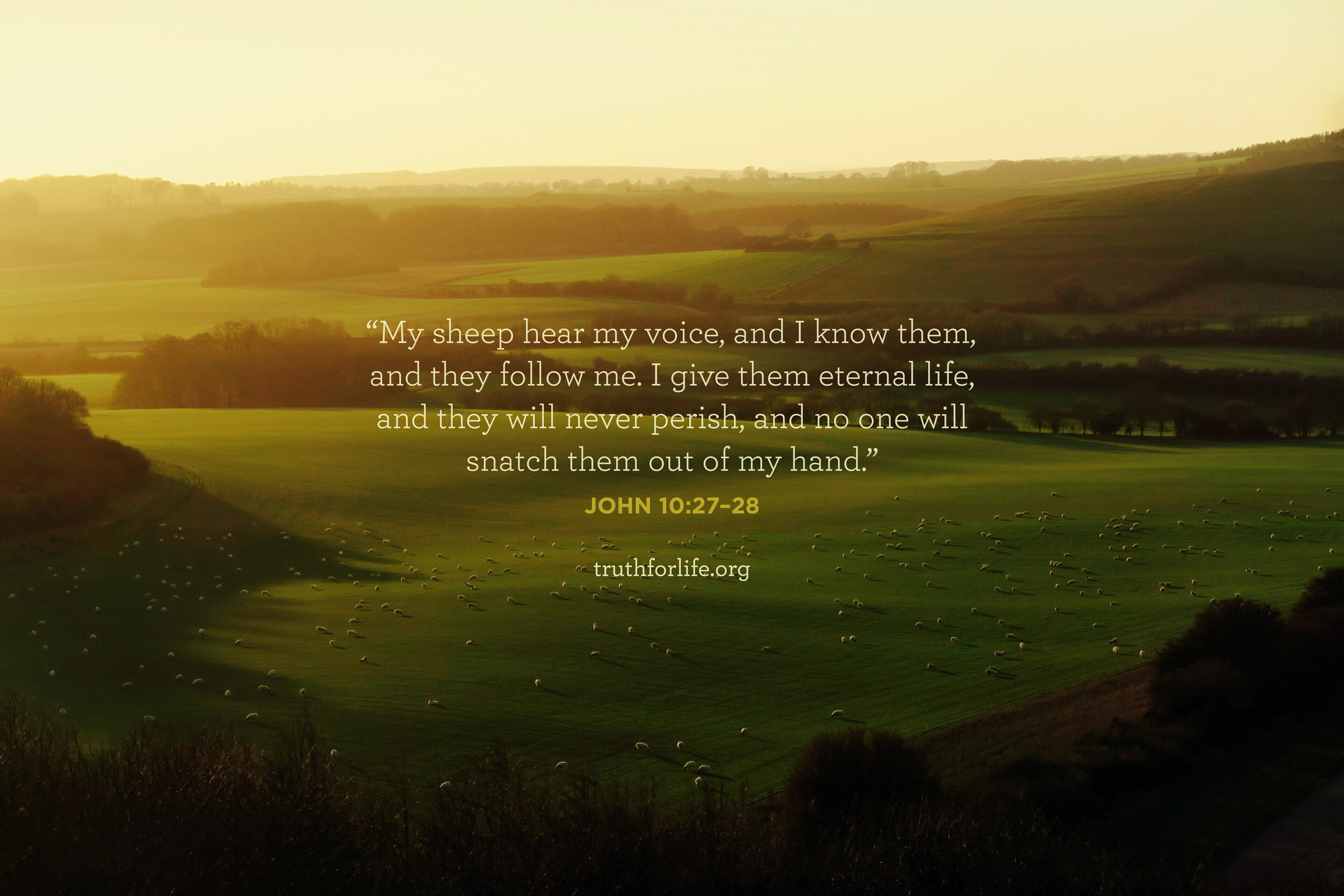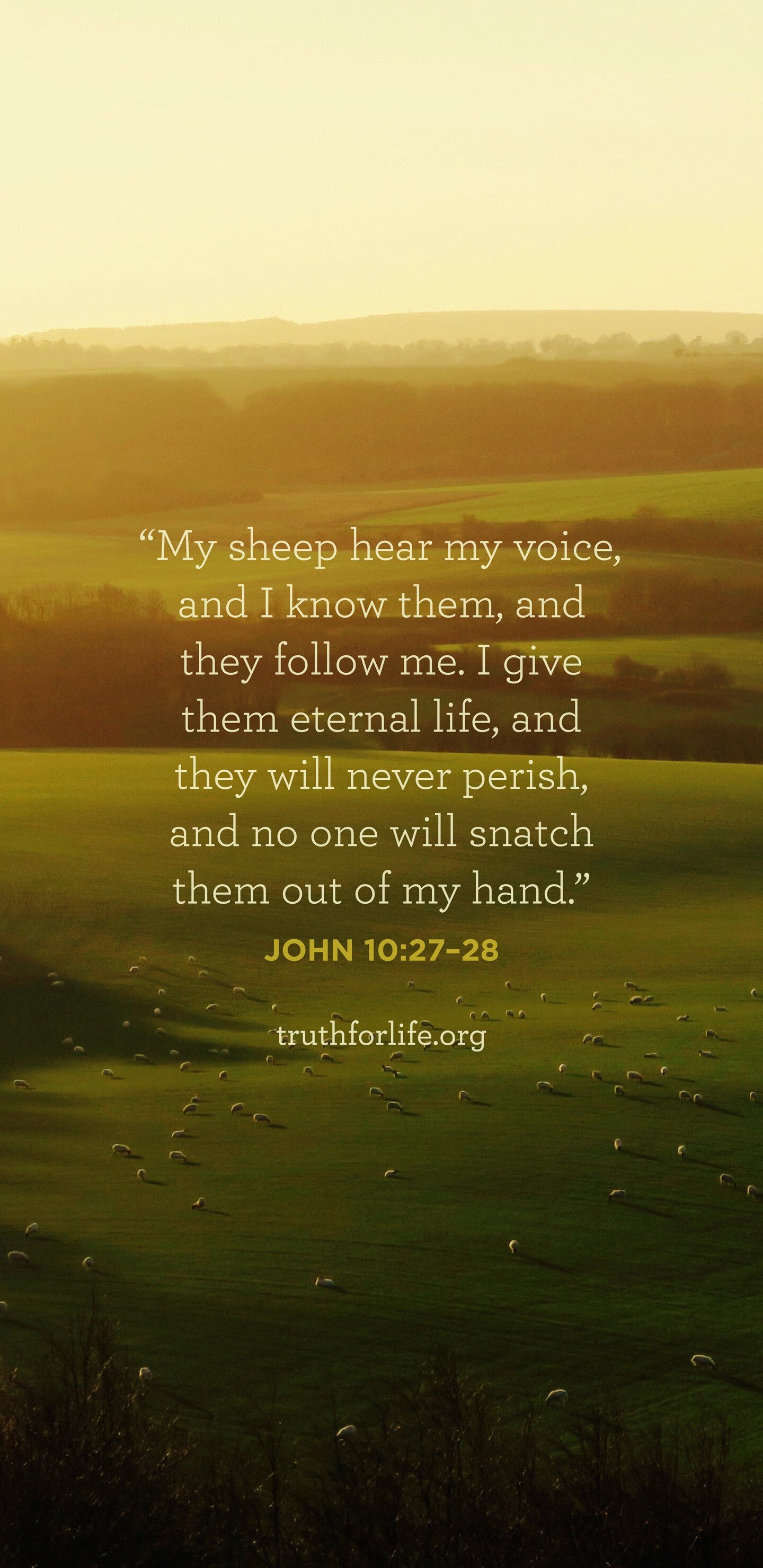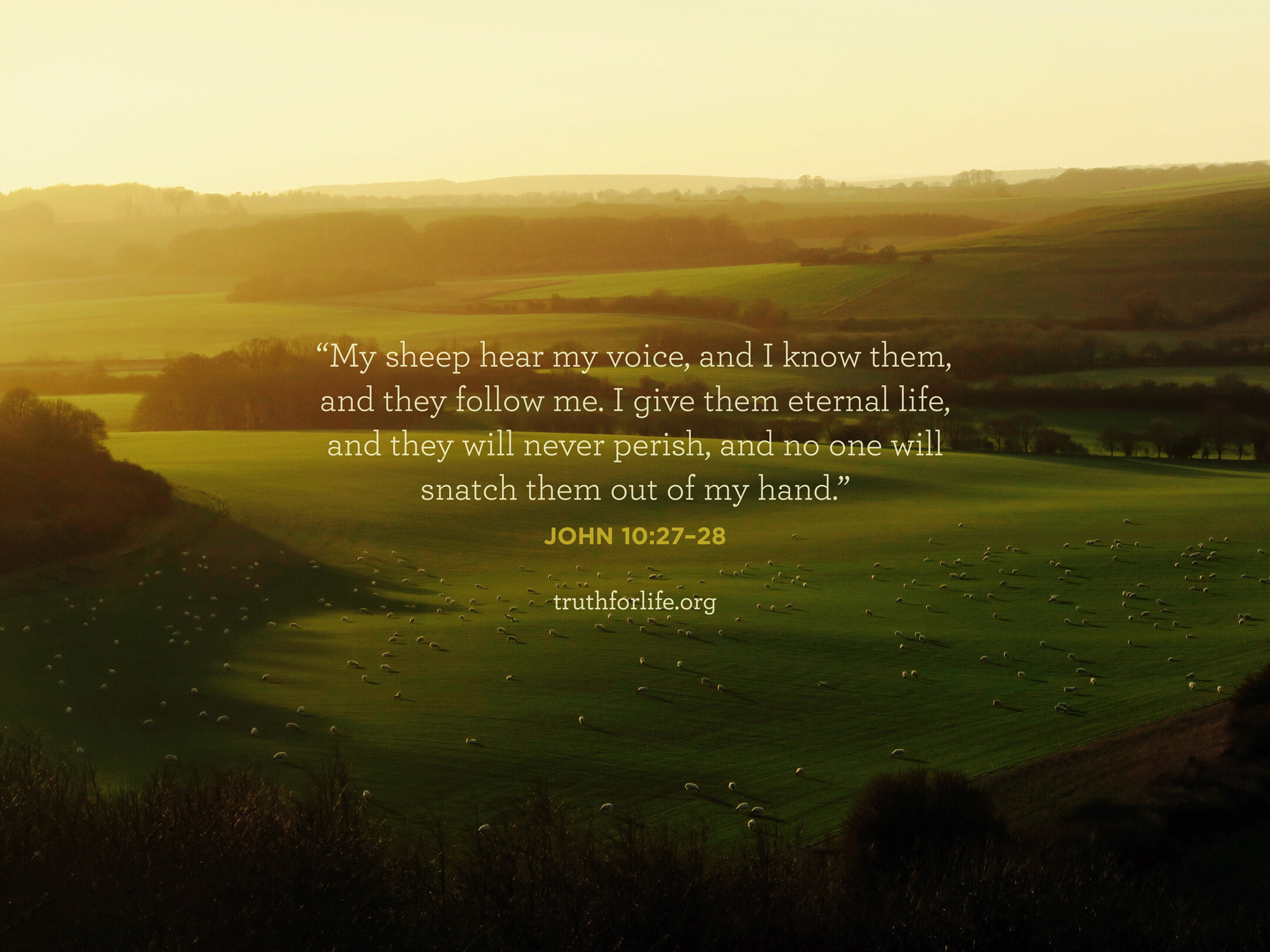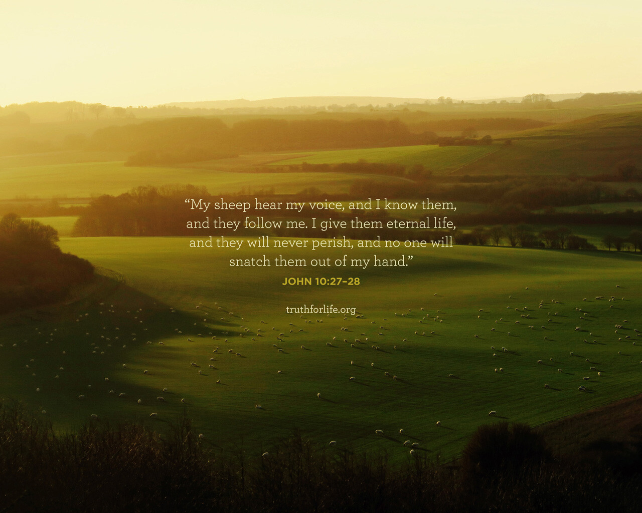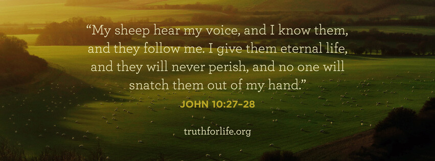 “My sheep hear my voice, and I know them, and they follow me. I give them eternal life, and they will never perish, and no one will snatch them out of my hand.”