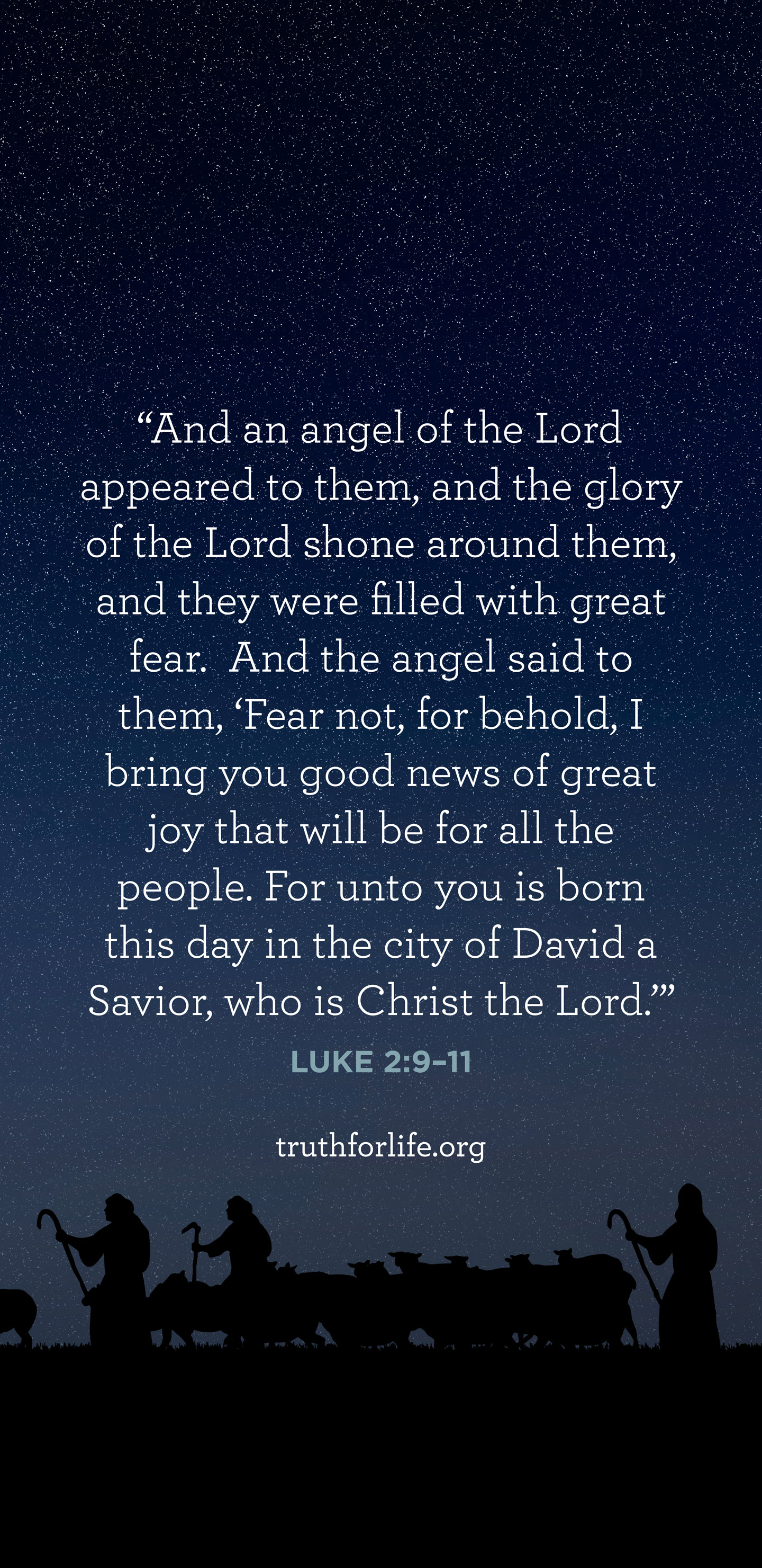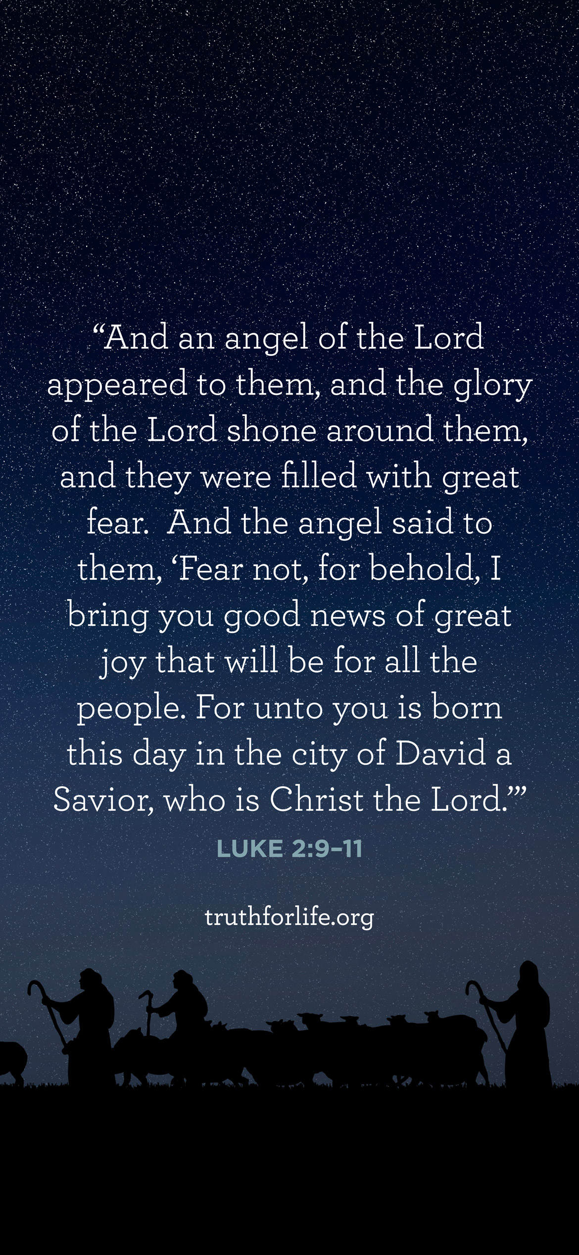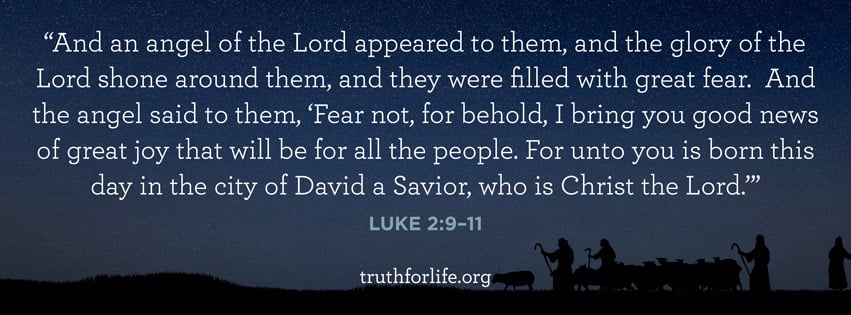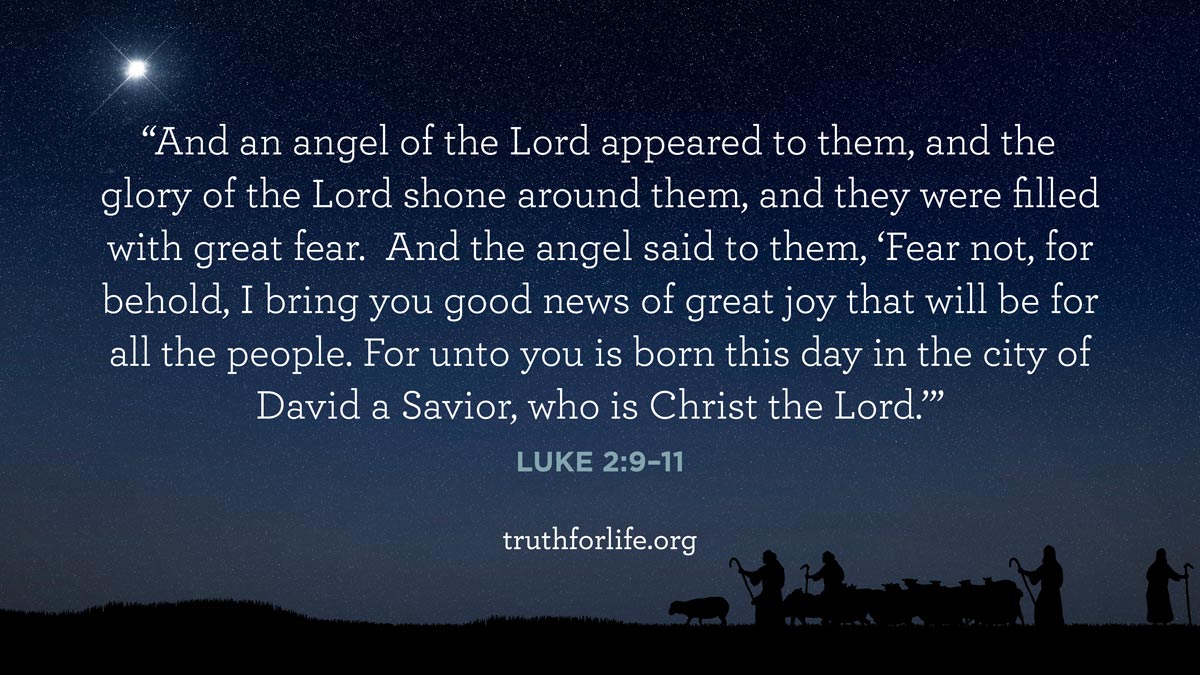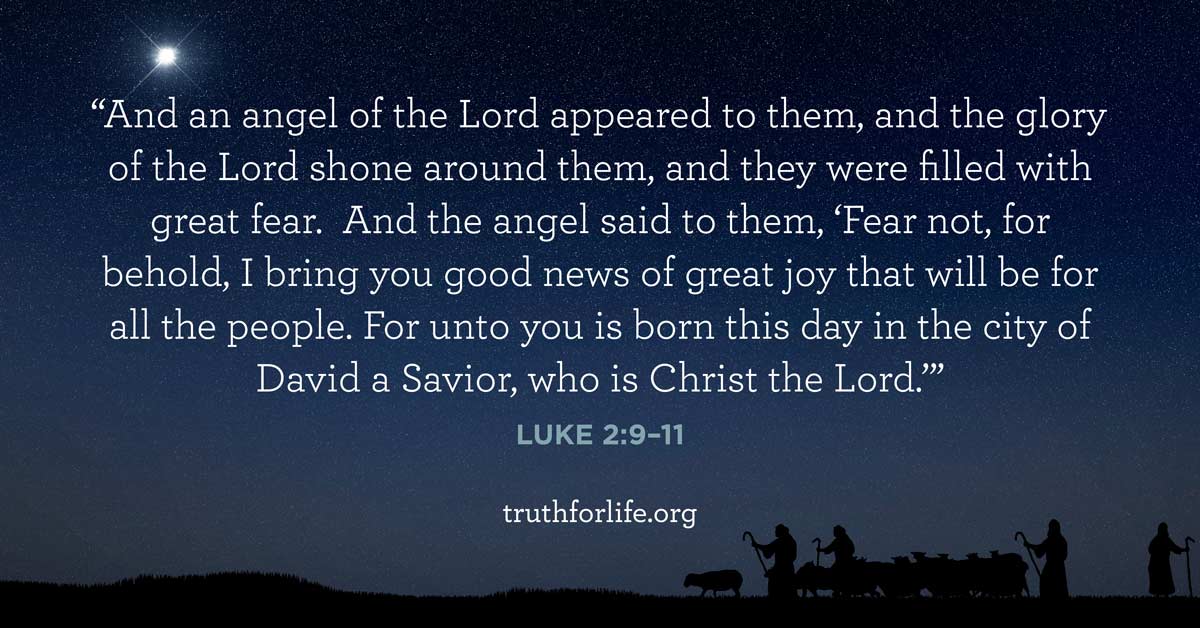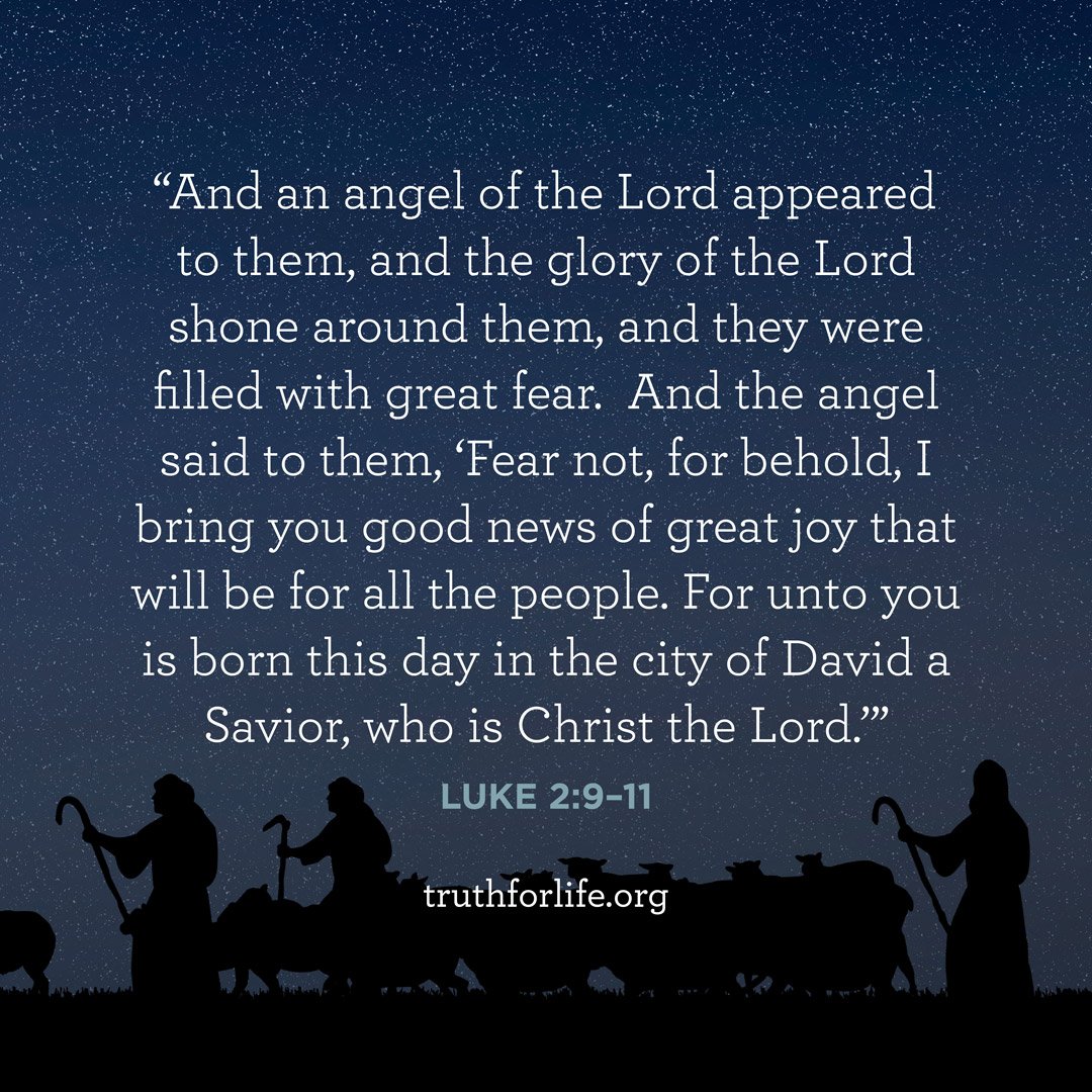 “And an angel of the Lord appeared to them, and the glory of the Lord shone around them, and they were filled with great fear. And the angel said to them, ‘Fear not, for behold, I bring you good news of great joy that will be for all the people. For unto you is born this day in the city of David a Savior, who is Christ the Lord.’”
