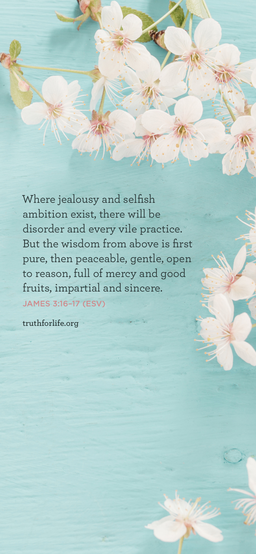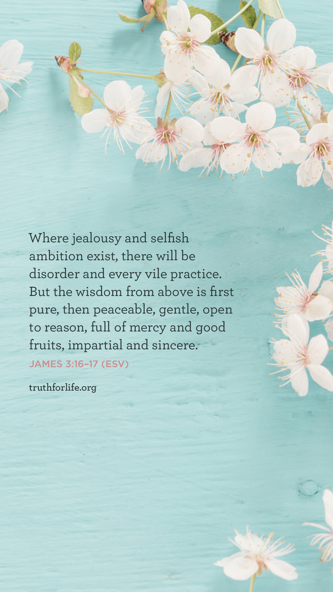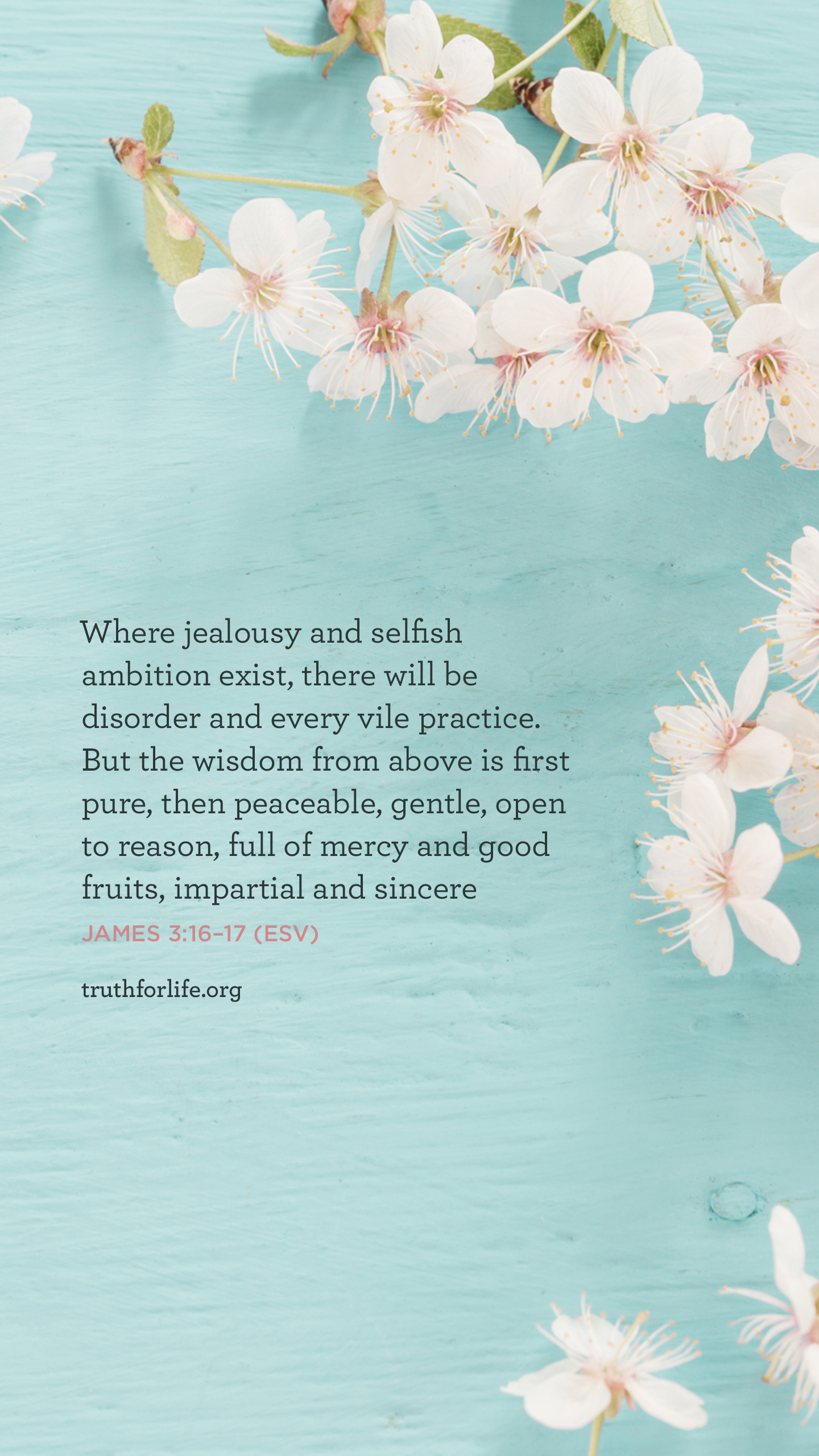 Where jealousy and selfish ambition exist, there will be disorder and every vile practice. But the wisdom from above is first pure, then peaceable, gentle, open to reason, full of mercy and good fruits, impartial and sincere. (James 3:16-17 ESV)